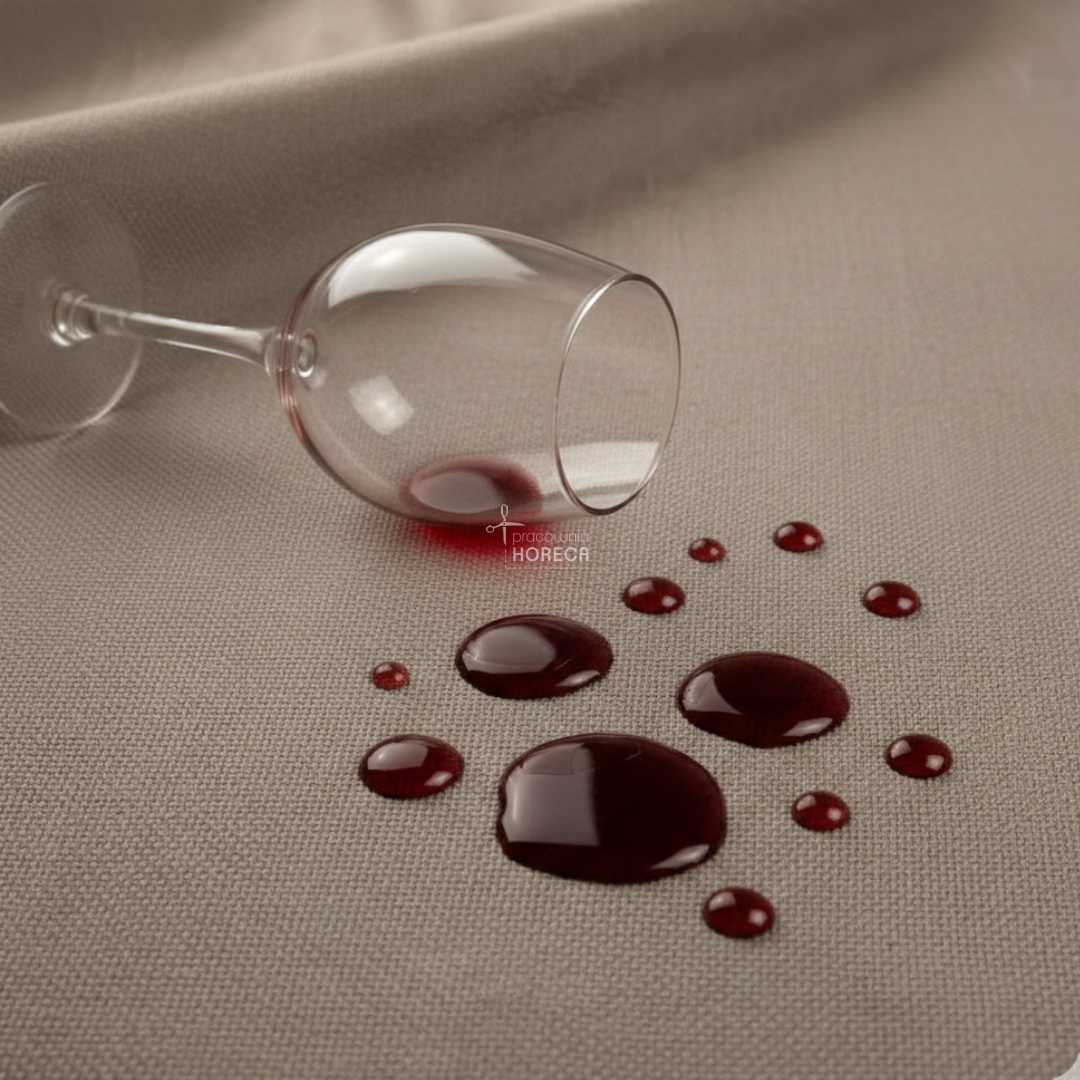 Głównym atutem obrusów Porto jest zastosowanie profesjonalnej apretury plamoodpornej. Dzięki tej powłoce: rozlane płyny – takie jak kawa, wino czy sosy – nie wsiąkają w tkaninę. Tworzą się na jej powierzchni krople, które można błyskawicznie usunąć za pomocą zwykłego ręcznika papierowego.
